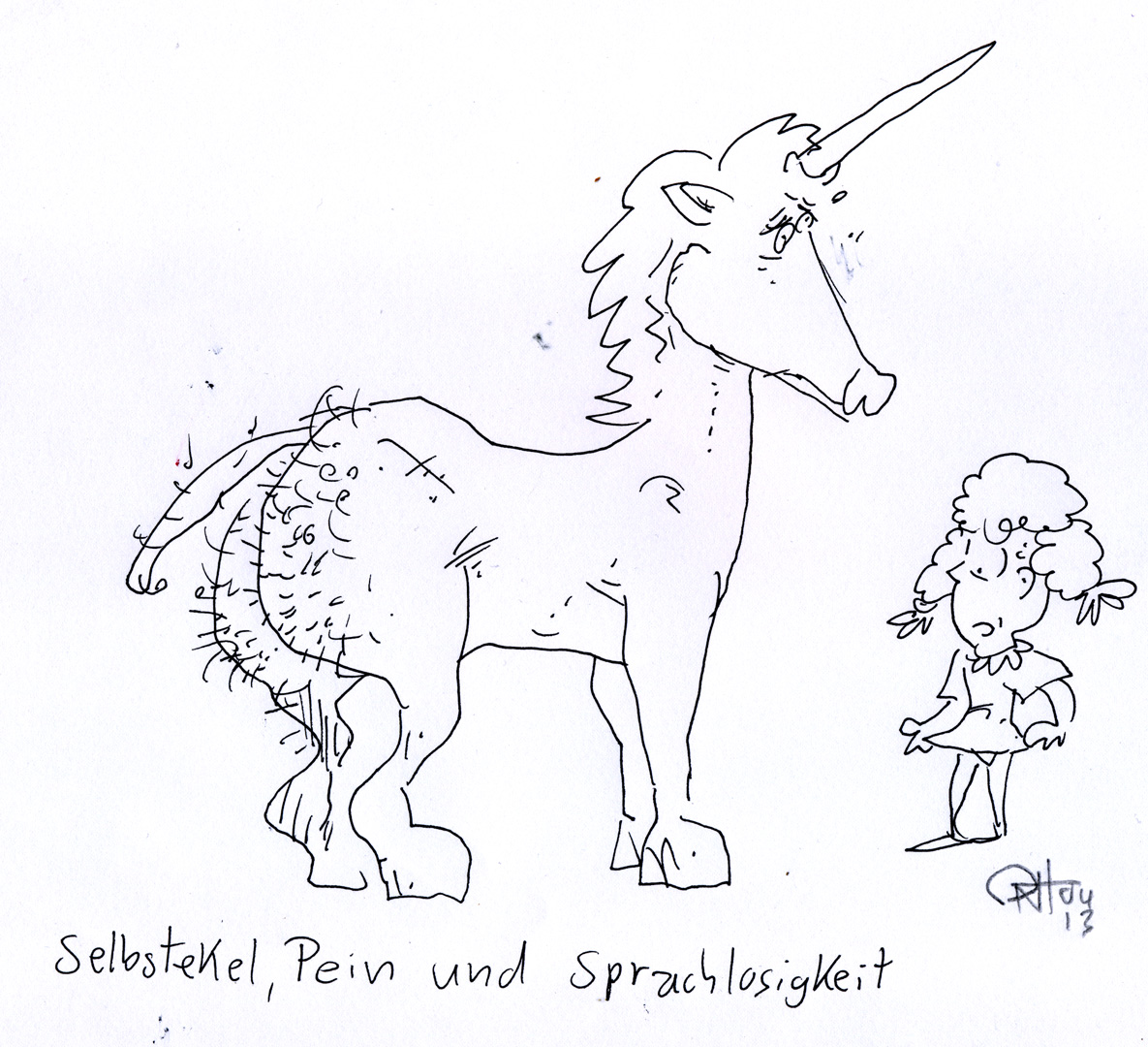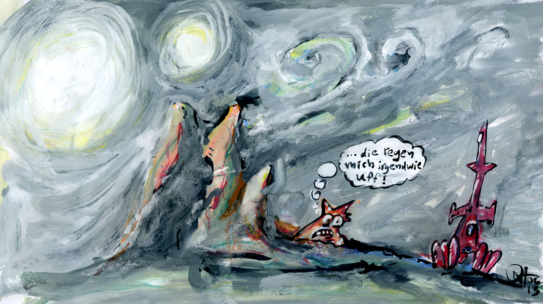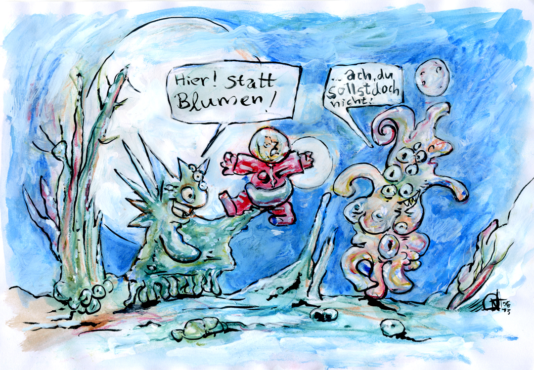 Denkt man sich vollständig in die Position des bedauernswerten Raumfahrers und stellt sowohl die Topographie der Umgebung als auch die physische und psychische Präsenz seines Gegenüber in Betracht, wird die Zeichnung zwar nicht unbedingt witziger aber ein wenig verstörender.